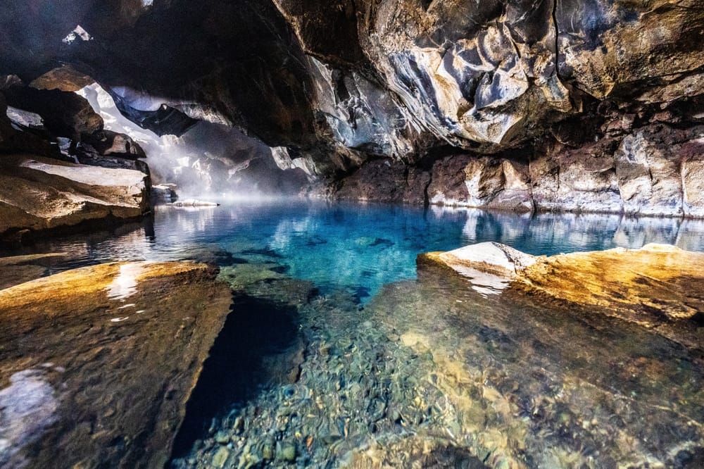 Another scenic stop is Grjótagjá, a small lava cave with a geothermal hot spring inside. The crystal blue water and volcanic surroundings make this a fascinating and photogenic location. Visitors are asked to respect the fragile environment and keep the area clean.