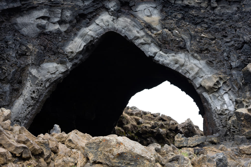 The tour continues to Dimmuborgir, often called the “Dark Castles”, where dramatic lava formations create a mysterious maze of towers, caves and arches. This stop also includes time for lunch, with local restaurants and cafés available nearby.